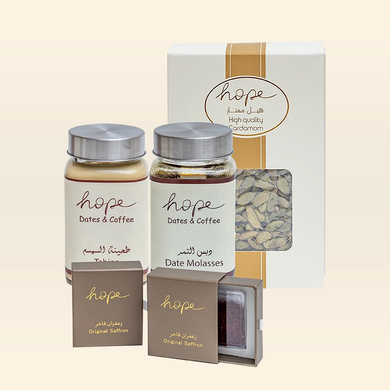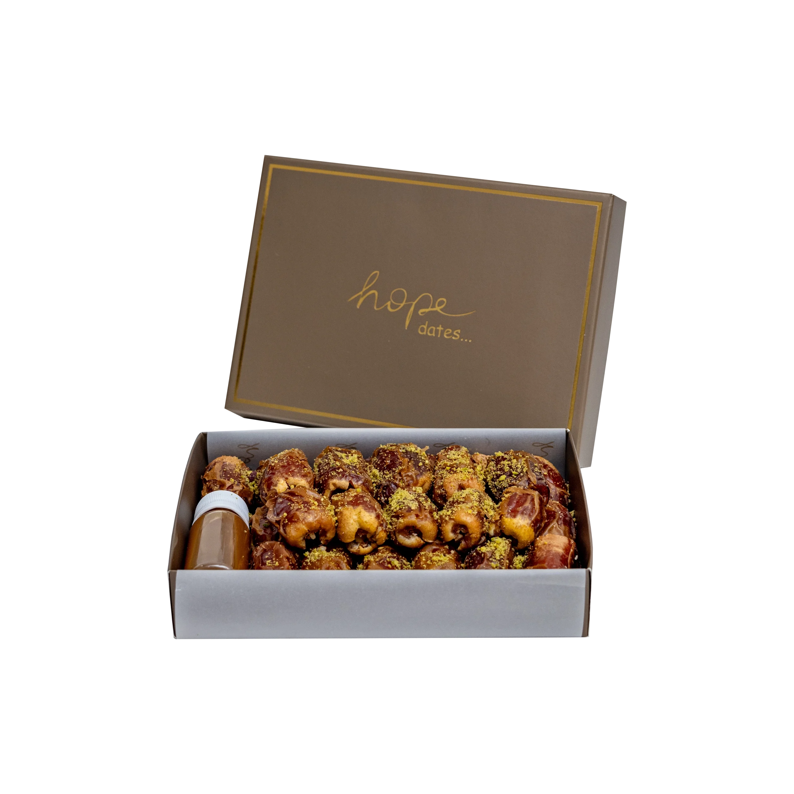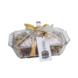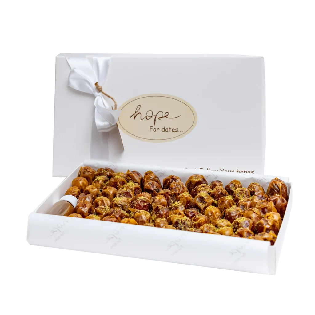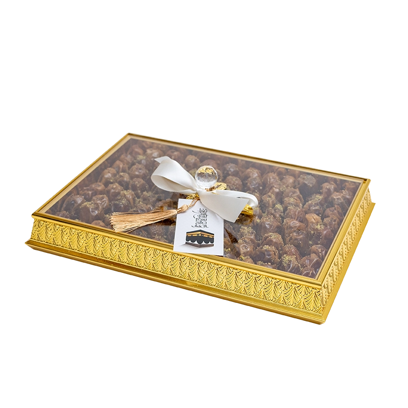 Celebrate special occasions with our exquisite Hajj & Umrah Gift Box. This luxurious package features 1.5 kilograms of premium Sugary dates, delicately stuffed with biscuit and cardamom, and accompanied by a rich caramel sauce for added indulgence. Elegantly presented in a golden box, this gift is perfect for sharing with loved ones or as a thoughtful present for those on their spiritual journey.