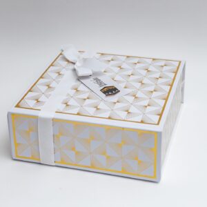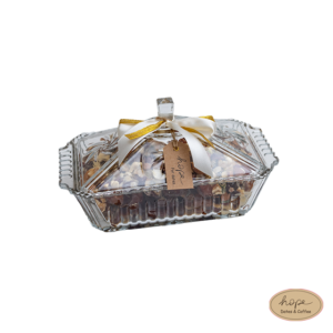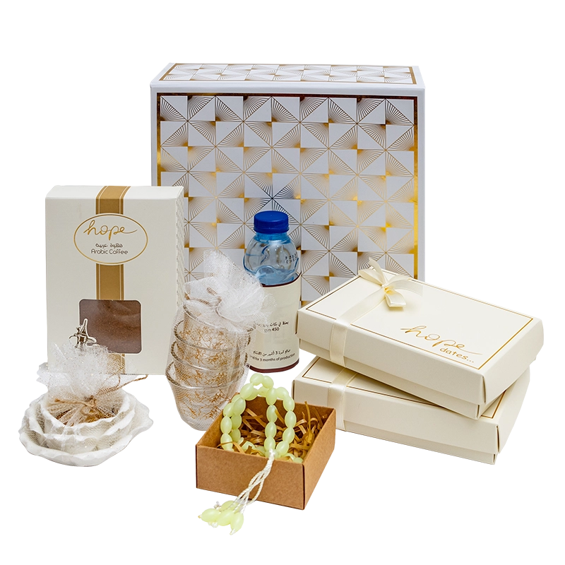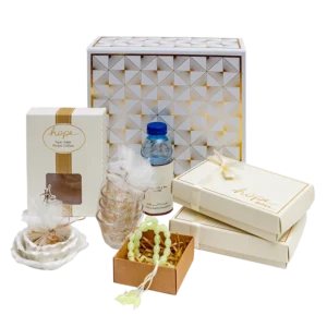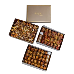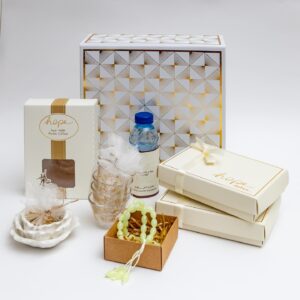 This luxurious gift set includes sugary Sukkary dates with biscuit and cardamom, Khalas dates with tahini and nuts, Arabic coffee, traditional coffee cups, a prayer bead, an incense burner, and Zamzam water. Perfect for gifting during Hajj and Umrah, it’s elegantly packaged to celebrate the spiritual journey.