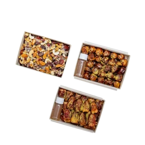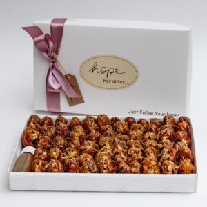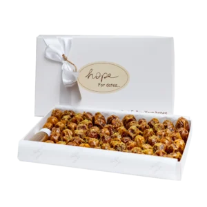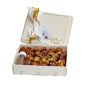 Celebrate special occasions with our exquisite Hajj & Umrah Gift Box. This luxurious package features 1.5 kilograms of premium Sugary dates, delicately stuffed with biscuit and cardamom, and accompanied by a rich caramel sauce for added indulgence. Elegantly presented in a golden box, this gift is perfect for sharing with loved ones or as a thoughtful present for those on their spiritual journey.